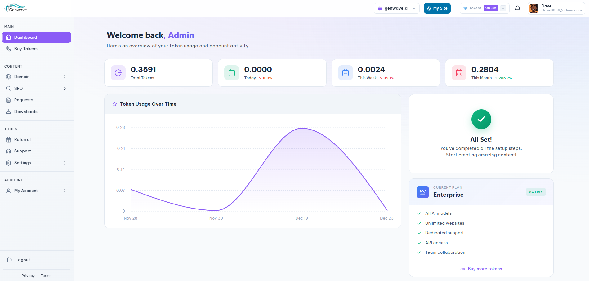 Gérez tous vos sites, clés API et création de contenu depuis un hub central. Suivez l'utilisation en temps réel, basculez entre les modèles IA instantanément, et ne payez que ce que vous utilisez.